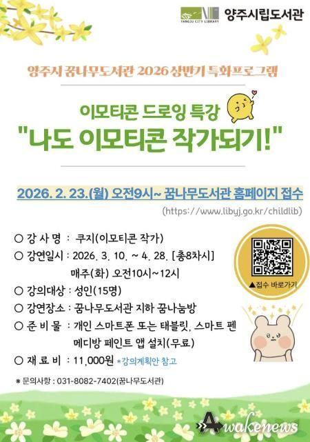 어웨이크뉴스 오경하 기자 | 양주시 꿈나무도서관이 2026년 특화주제 프로그램으로 성인 대상의 ‘이모티콘 드로잉 특강’을 3월 10일부터 8주간 운영한다.