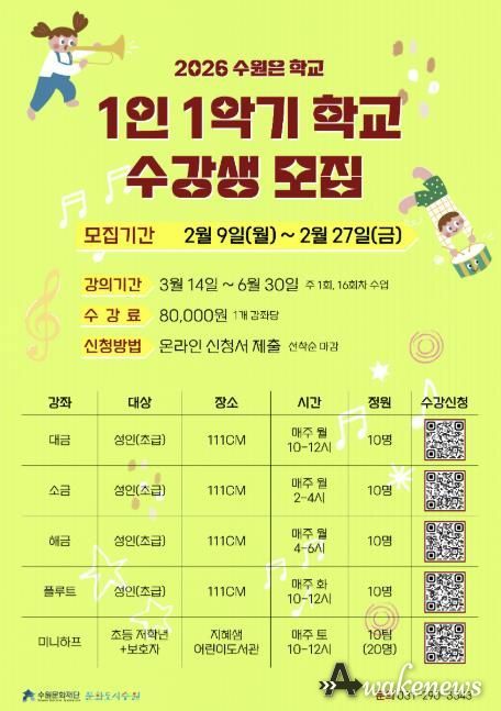 어웨이크뉴스 오경하 기자 | 수원문화재단이 오는 27일까지 시민 누구나 참여할 수 있는 ‘2026 수원은학교 1인 1악기 학교’ 수강생을 선착순으로 모집한다.