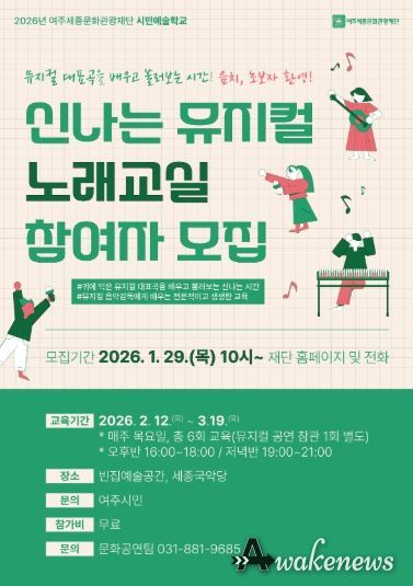 어웨이크뉴스 오경하 기자 | 여주세종문화관광재단은 오는 12일부터 시민예술학교 프로그램의 일환으로 ‘신나는 뮤지컬 노래교실’을 운영한다.