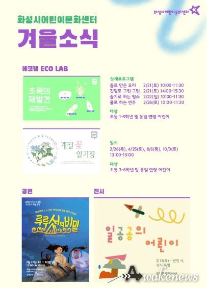 어웨이크뉴스 오경하 기자 | 화성시어린이문화센터는 새해를 맞아 지역 생태환경을 주제로 한 특별 교육 프로그램‘에코랩(Eco Lab)’을 운영한다고 9일 밝혔다.