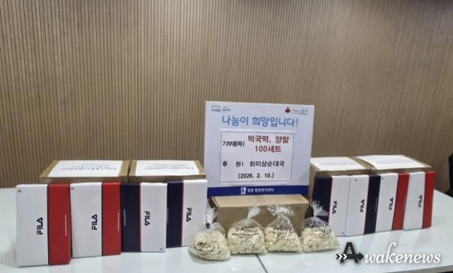 어웨이크뉴스 오경하 기자 | 최미삼순대국 고색점은 지난 10일, 다가오는 설 명절을 맞아 평동 행정복지센터에 떡국떡 100인분과 양말세트 100개를 기탁했다.