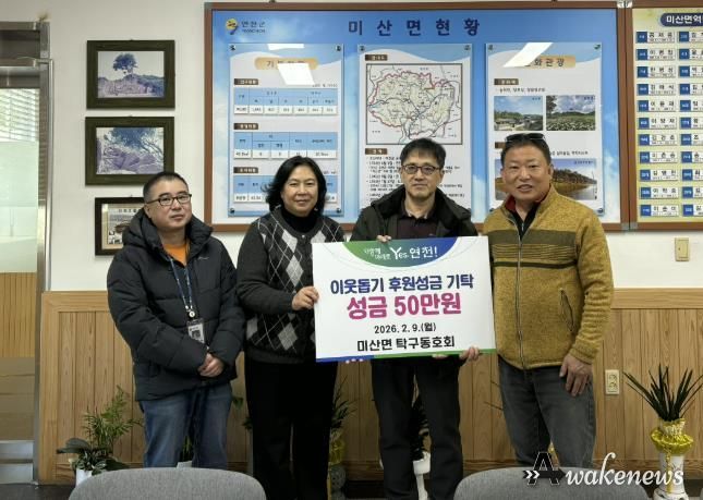 어웨이크뉴스 오경하 기자 | 미산면 탁구동호회는 지난 9일 미산면 지역사회보장협의체에 이웃돕기 성금 50만원을 기탁했다.