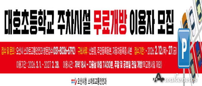 어웨이크뉴스 오경하 기자 | 오산시는 오는 2월 12일부터 27일까지 ‘대호초등학교 주차시설 무료개방’ 사업의 2년 차 이용자를 모집한다고 밝혔다.