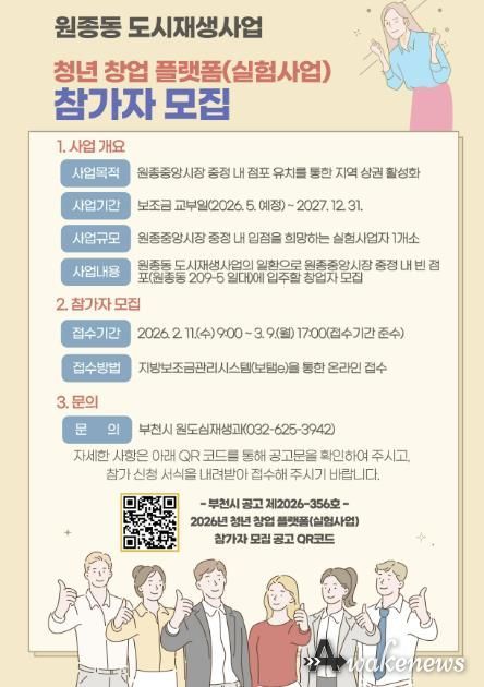 사업 참가는 지방보조금관리시스템 ‘보탬e’를 통해 온라인으로 접수할 수 있으며, 서류 심사와 면담 심사를 거쳐 최종 참가자를 선정한다. 사업 관련 자세한 내용은 부천시 홈페이지 공고문에서 확인할 수 있다.
