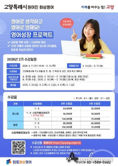 어웨이크뉴스 오경하 기자 | 고양특례시는 2월 11일 접수를 시작으로 3월 12일까지 ‘2026년 2기 원어민 화상영어’수강생을 모집한다고 밝혔다.