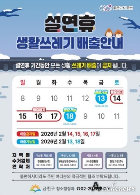 어웨이크뉴스 오경하 기자 | 금천구는 설 연휴 기간 생활쓰레기(일반생활쓰레기, 음식물쓰레기, 재활용품) 수거를 일시 중단한다고 밝혔다.