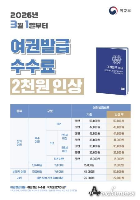 어웨이크뉴스 오경하 기자 | 외교부의 여권법 시행령 개정으로 오는 3월 1일부터 여권 발급 수수료가 2천원 인상된다. 유효기간 10년 복수여권의 경우 58면 기준 5만원에서 5만2천원으로, 26면 기준 4만7천원에서 4만 9천원으로 변경 예정이다.