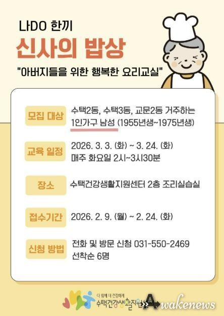 어웨이크뉴스 오경하 기자 | 구리시 수택건강생활지원센터는 오는 2월 24일까지 관내 1인 가구 남성을 위한 체험형 건강 식생활 프로그램인 ‘나DO한끼 신사의 밥상’ 참여자를 모집한다고 밝혔다.