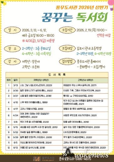 어웨이크뉴스 오경하 기자 | 김포시 풍무도서관은 오는 3월 13일부터 6월 12일까지 매주 금요일 총 12회에 걸쳐 2026년 상반기 ‘꿈꾸는 독서회’를 운영한다.