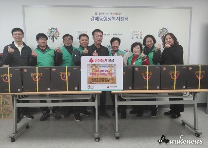 어웨이크뉴스 오경하 기자 | 구리시는 갈매동 새마을지도자협의회와 새마을부녀회가 지난 12일 오후 2시 갈매동 행정복지센터에서 관내에 거주하는 돌봄 취약계층 40가구에 60만 원 상당의 조미김 40박스를 후원했다고 밝혔다.