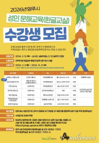 어웨이크뉴스 오경하 기자 | 양주시가 오는 3월 13일까지 학력인정 문해교육인 ▲ 보담학교 초등 3단계(졸업과정)와 ▲ 보담학교 중학 1단계 과정의 수강생을 모집한다.