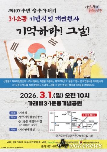 어웨이크뉴스 오경하 기자 | 양주시가 오는 3월 1일 오전 10시, 광적면 가래비 3.1운동 기념공원(양주시 광적면 가납리 732-18)에서 ‘제107주년 양주 가래비 3.1운동 기념식 및 재연행사’를 개최한다.