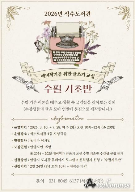 어웨이크뉴스 오경하 기자 | 안양시 석수도서관은 문학과 글쓰기에 관심 있는 안양 시민을 대상으로 ‘예비작가를 위한 글쓰기 교실’ 수필 기초반 및 소설 창작반을 운영한다고 13일 밝혔다.