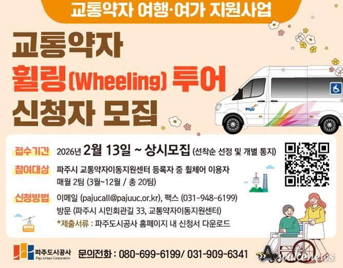 어웨이크뉴스 오경하 기자 | 파주시 교통약자이동지원센터는 교통약자의 이동권 확대와 여가 활동 증진을 위해 '교통약자 휠링(Wheeling) 투어 지원사업'을 3월부터 본격 운영한다고 밝혔다.