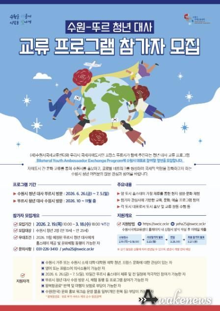 어웨이크뉴스 오경하 기자 | 수원시국제교류센터는 수원시의 국제자매도시인 프랑스 뚜르시와 추진하는 ‘2026 수원-뚜르 청년 대사 교류 프로그램’에 참여할 수원시 청년 2명을 3월 18일까지 모집한다.