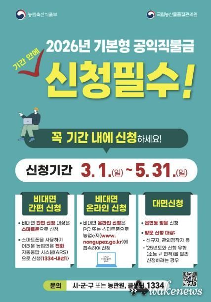 어웨이크뉴스 오경하 기자 | 포천시는 오는 3월 1일부터 농업의 공익적 기능을 강화하고 농업인의 소득 안정을 지원하기 위한 ‘2026년 기본형 공익직접지불금’ 신청을 받는다.