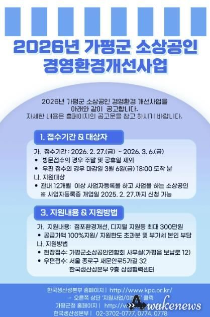 어웨이크뉴스 오경하 기자 | 가평군은 관내 소상공인의 지속경영 기반을 강화하기 위해 ‘2026년 가평군 소상공인 경영환경개선사업’ 대상자를 3월 6일까지 모집한다고 밝혔다.