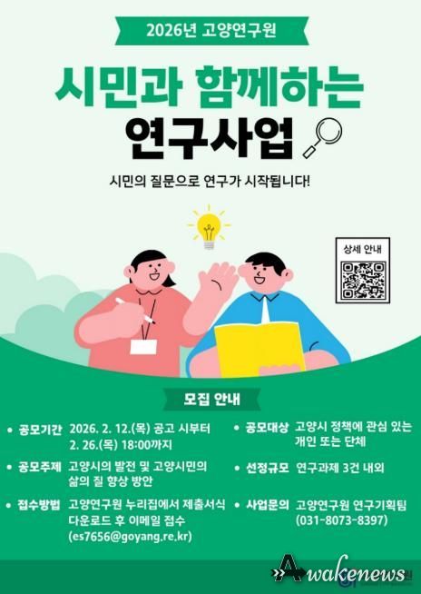 어웨이크뉴스 오경하 기자 | 고양연구원은 시민과 함께 고양시의 미래를 설계하는 문제해결형 연구를 추진하기 위해 ‘시민과 함께하는 연구사업’ 공개 모집을 오는 2월 26일까지 진행한다.