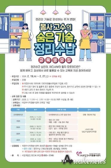 어웨이크뉴스 오경하 기자 | 의정부시자원봉사센터는 시민들의 주거환경 개선 역량 강화를 위해'봉사고수의 숨은 기술, 정리수납 교육'을 오는 3월 11일부터 4월 1일까지 매주 수요일 오후 2시부터 4시까지 총 4회에 걸쳐 진행하며, 이에 따른 참여자를 오는 2월 27일까지 모집한다.