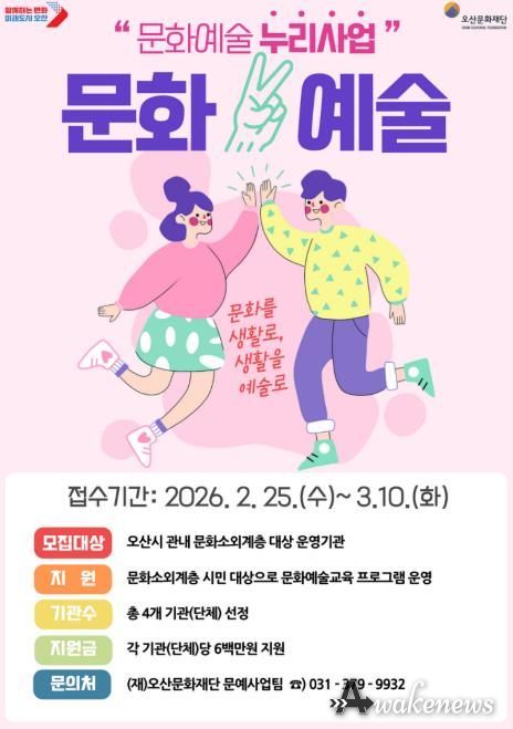 어웨이크뉴스 오경하 기자 | (재)오산문화재단은 경제적·지리적·신체적 제약 등으로 문화예술 향유 기회가 제한된 문화소외계층을 지원하기 위해 ‘2026 문화예술 누리사업’을 추진한다고 밝혔다.