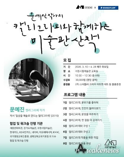 어웨이크뉴스 오경하 기자 | 수원시립미술관은 독일 문구 기업 ㈜스테들러 코리아와 공동으로 '캘리그라피와 함께하는 미술관 산책'을 3월 10일부터 4월 28일까지 운영하며 참가자를 모집한다.
