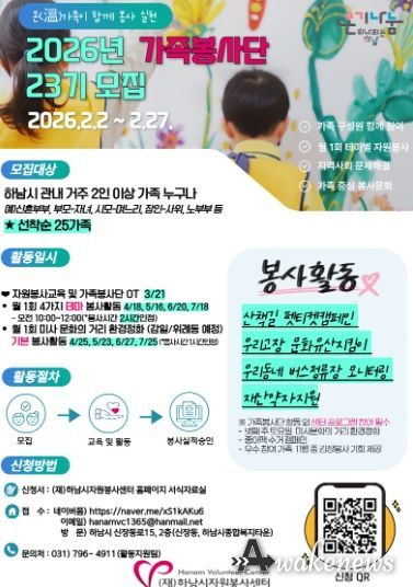 어웨이크뉴스 오경하 기자 | (재)하남시자원봉사센터는 가족이 함께 참여하는 자원봉사 프로그램인‘제23기 하남시자원봉사센터 가족봉사단’참여 가족을 선착순 25가족 모집한다.