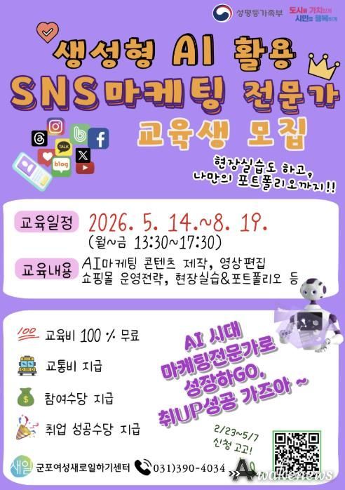 어웨이크뉴스 오경하 기자 | 군포여성새로일하기센터는 급변하는 디지털 전환 시대에 맞춰 청년 여성 구직자와 경력보유여성의 취업 경쟁력을 높이고 성공적인 재취업을 지원하기 위해 2026년 성평등가족부 고부가가치 직업교육훈련 과정인 ‘생성형 AI 활용 SNS마케팅 전문가과정’ 교육생을 모집한다
