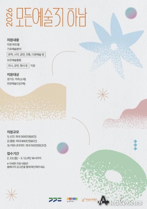 2026 경기예술활동지원 ‘모든예술31’은 경기도 31개 시·군의 지역 예술 생태계 활성화를 위해 추진되는 사업으로 기초예술분야(문학·시각·공연·전통 등)의 다양한 예술 활동을 폭넓게 지원한다.