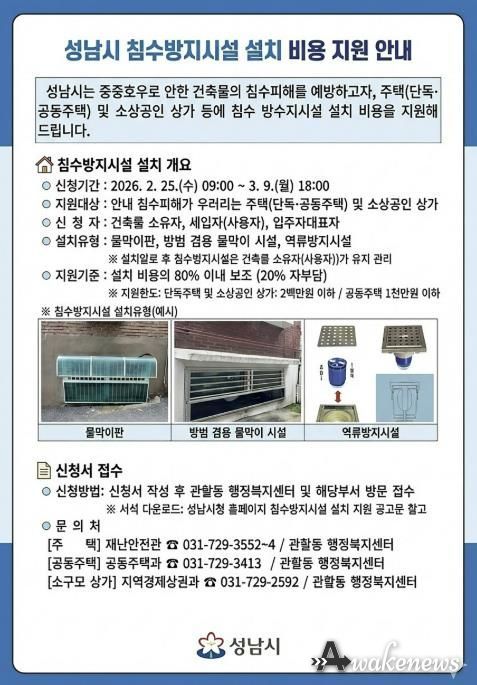 어웨이크뉴스 오경하 기자 | 성남시는 여름철 집중호우로 인한 주택과 상가의 침수 피해를 사전에 예방하기 위해 침수방지시설 설치 비용을 최대 80%까지 지원한다.