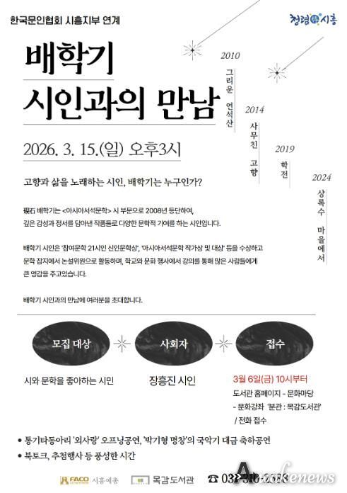 이번 만남은 3월 15일 오후 3시, 목감도서관 지하 1층 다목적실에서 진행되며, 시와 문학에 관심이 있는 50여 명의 시민과 함께한다. 시인이 직접 자신의 작품을 낭독하고, 시를 쓰게 된 계기와 창작 과정에 관한 이야기를 들려줄 예정이다. 또한, 시민들과 자유롭게 질문을 나누며 시와 삶에 대해 편안하게 대화하는 시간도 마련된다.