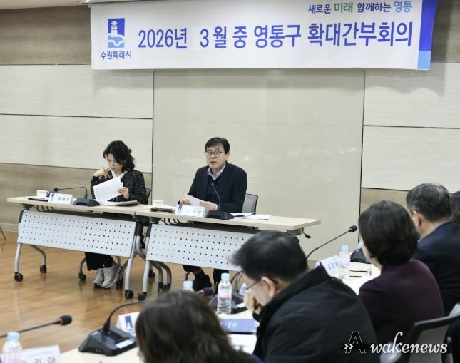 어웨이크뉴스 오경하 기자 | 수원특례시 영통구는 지난 24일, 구청 상황실에서 ‘2026년 3월 확대간부회의’를 개최하고, 구정 주요 현안을 집중 점검했다.