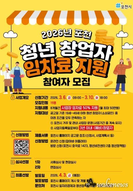 어웨이크뉴스 오경하 기자 | 포천시는 청년 창업자의 안정적인 창업 환경 조성과 창업 지속 가능성 제고를 위해 '2026년 청년 창업자 임차료 지원사업' 참여자를 2026년 3월 6일부터 10일까지 모집한다.
