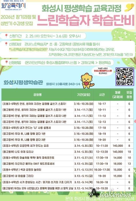 어웨이크뉴스 오경하 기자 | 화성특례시는 2월 25일부터 3월 6일까지 ‘느린학습자 학습단비’ 장기 과정 및 상반기 수강생을 모집한다고 밝혔다.
