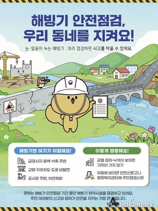 어웨이크뉴스 오경하 기자 | 안성시는 해빙기 안전사고 예방을 위해 2월 23일부터 4월 10일까지 ‘해빙기 취약시설 안전점검’을 실시한다고 밝혔다.