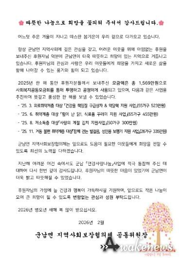 어웨이크뉴스 오경하 기자 | 군남면지역사회보장협의체는 지난 한 해 동안 지역 내 소외된 이웃을 위해 따뜻한 나눔을 실천해 준 후원자들에게 감사 서한문을 지난 25일 발송했다.