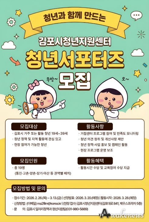 어웨이크뉴스 오경하 기자 | 김포시는 청년지원센터 거점 프로그램 운영 현장의 청년 참여를 확대하기 위해, ‘청년서포터즈’ 를 공개모집한다. 모집기간은 2월 26일부터 3월 13일까지다.