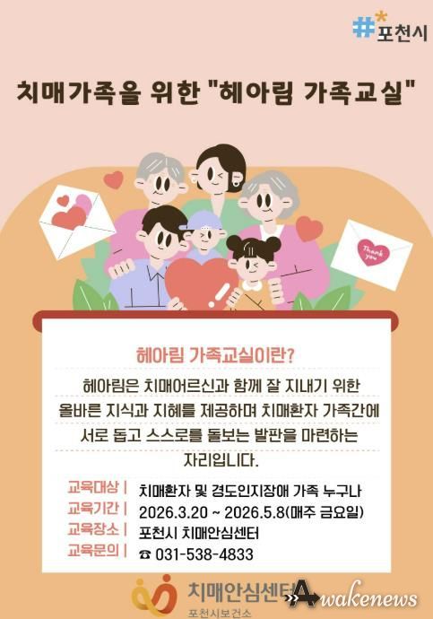 어웨이크뉴스 오경하 기자 | 포천시 치매안심센터는 오는 3월 20일부터 치매환자 가족을 대상으로 상반기 ‘헤아림’ 가족교실 프로그램을 운영하고, 참여자를 모집한다.