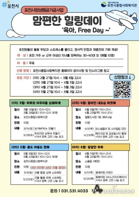어웨이크뉴스 오경하 기자 | 포천시종합사회복지관은 2026년 포천시 양성평등기금 지원사업의 일환으로 지역 내 미성년 자녀를 양육하는 부모를 위한 ‘맘(Mom)편한 힐링데이’를 운영하고, 참여자를 선착순 모집한다고 밝혔다.