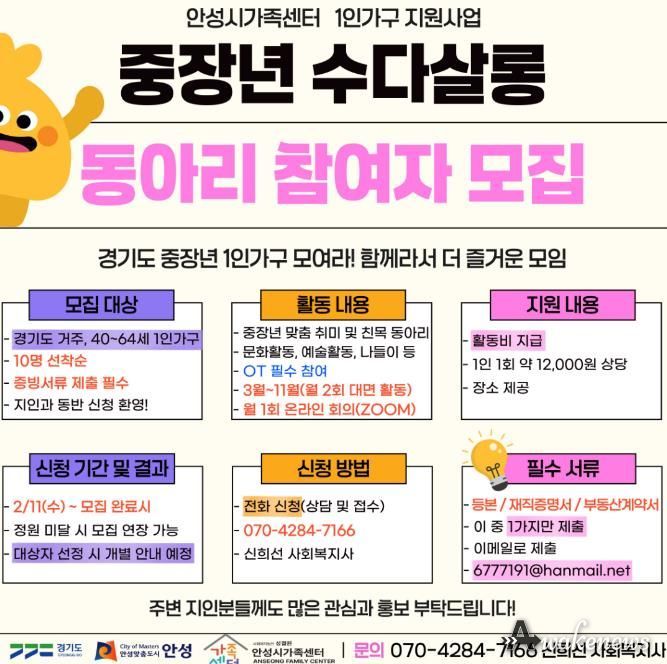 어웨이크뉴스 오경하 기자 | 안성시 가족센터는 경기도 거주 중장년 1인 가구(40세~64세)를 대상으로 사회적 관계망 형성을 위한 ‘중장년 수다살롱’ 동아리 참여자를 모집한다.