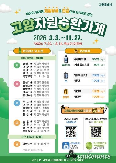 어웨이크뉴스 오경하 기자 | 고양특례시는 시민들의 올바른 분리배출 실천을 유도하고 고품질 재활용 문화 확산을 위해 자원순환가게 운영을 오는 3월 3일부터 시작한다고 밝혔다.