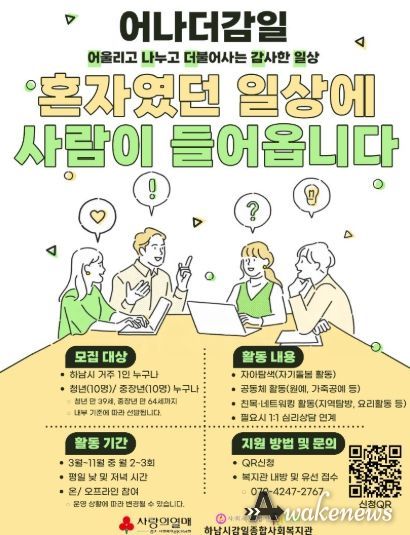 어웨이크뉴스 오경하 기자 | 하남시감일종합사회복지관(사회복지법인 휴먼복지회 운영)은 2026년 1월부터 12월까지 1인 가구의 사회적 관계망 형성과 지역사회 참여 확대를 위한 특화사업 '어나더 감일(어울리고 나누고 더불어사는 감사한 일상)'을 운영하며 이에 참여할 대상자를 모집한다.
