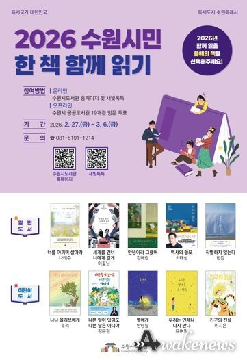 어웨이크뉴스 오경하 기자 | 수원시도서관이 ‘2026 수원시민 한 책 함께 읽기’ 올해의 책을 선정하기 위한 설문조사를 3월 6일까지 한다.