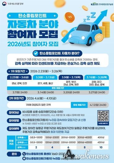 어웨이크뉴스 오경하 기자 | 용인특례시는 3일부터 운전자의 자발적인 온실가스 감축을 유도하기 위한 ‘2026년 탄소중립포인트제 자동차 분야’ 참여자를 모집한다고 밝혔다.