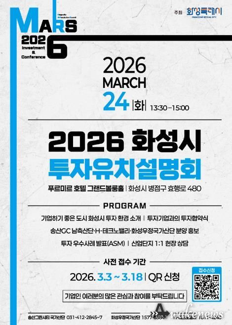 어웨이크뉴스 오경하 기자 | 화성특례시가 오는 3월 24일 푸르미르 호텔에서 ‘2026 화성특례시 투자유치 설명회’를 개최하고, 3월 3일부터 3월 18일까지 QR코드를 통한 사전접수를 진행한다.