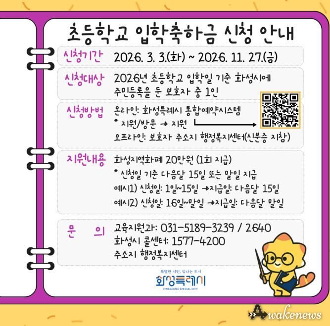 어웨이크뉴스 오경하 기자 | 화성특례시는 2026학년도 초등학교 1학년 입학생을 대상으로 ‘초등학교 입학축하금 지원사업’을 시행한다.