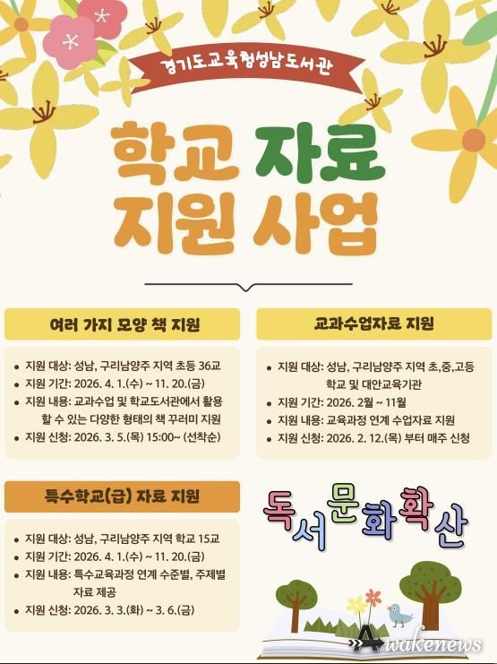어웨이크뉴스 오경하 기자 | 경기도교육청성남도서관이 성남 및 구리·남양주 지역 학생들의 독서교육을 위해 䃳대 맞춤형 자료 지원 사업’을 운영한다.
