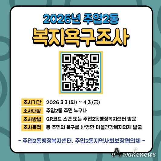 어웨이크뉴스 오경하 기자 | 고양특례시 일산서구 주엽2동은 주민이 함께 만드는 ‘2026년 주엽2동 마을건강복지계획’ 수립·추진을 위해 3월 3일부터 4월 3일까지 주민 복지욕구조사를 실시한다.