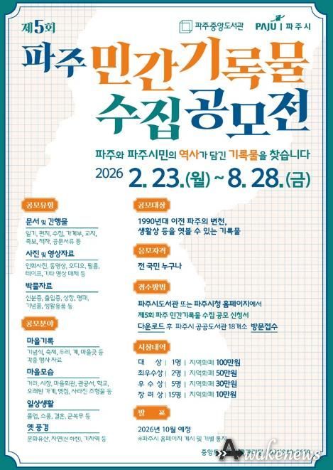 어웨이크뉴스 오경하 기자 | 파주시 중앙도서관은 시민의 삶 속에 남아 있는 기록을 통해 지역의 역사를 되살리고자 2월 23일부터 8월 28일까지 ‘제5회 파주 민간기록물 수집 공모전’을 개최한다.