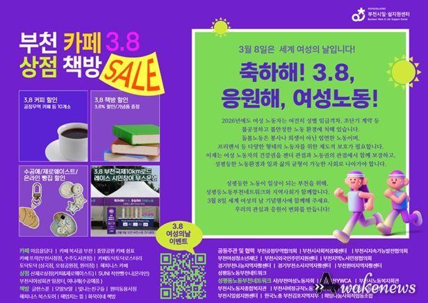 어웨이크뉴스 오경하 기자 | 성평등노동부천네트워크는 3월 4일부터, ‘세계 여성의 날’을 기념하여 부천시 공정무역 카페, 동네 책방, 상점 등 20여 개소에서 ‘3.8 가격 할인’, ‘기념품 증정’ 등 다채로운 이벤트를 추진한다고 밝혔다.