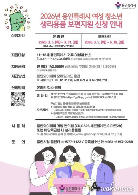 이상일 시장은 “생리용품 지원은 성장기 여성 청소년의 기본적인 건강권을 보장하고 정서적 안정감을 높여 보다 건강한 성장을 돕는 기반이 될 것”이라며 “청소년뿐 아니라 노인, 장애인 등 110만 용인 시민이 피부로 느낄 수 있는 생활밀착형 복지 정책을 지속적으로 추진하겠다”고 했다.